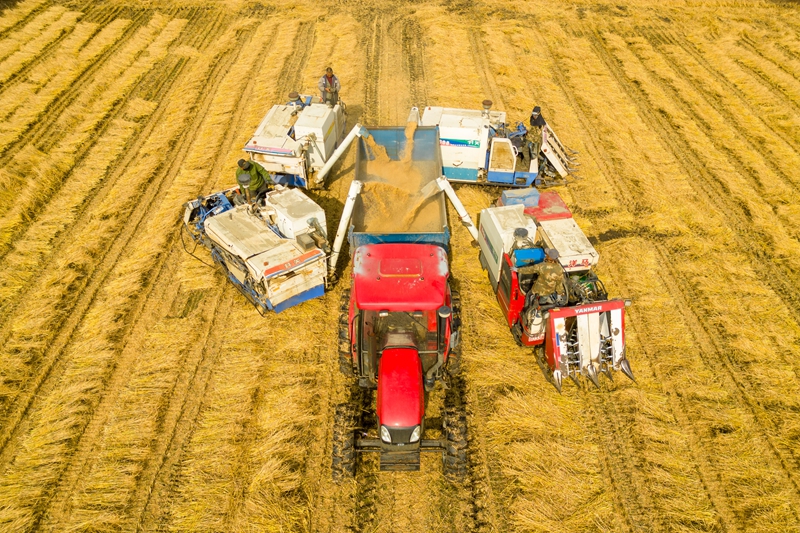 在黑龍江省綏化市北林區(qū)雙河鎮(zhèn),村民駕駛收割機進(jìn)行卸糧作業(yè)(2024年10月13日攝,無人機照片)。新華社記者 張濤 攝