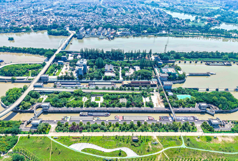 2025年7月4日,船舶有序通過京杭大運(yùn)河揚(yáng)州段邵伯船閘(無人機(jī)照片)。新華社發(fā)(任飛 攝)
