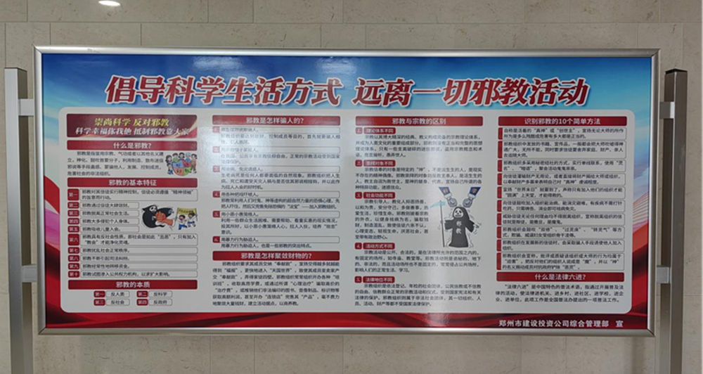 為了進一步提高國企員工反邪教意識,認識邪教的危害,切實增強自覺抵御邪教侵蝕的能力,營造積極向上、健康和諧的工作氛圍。4月25日下午,鄭州市建設投資集團有限公司組織全體干部員工開展反對邪教宣傳活動。利用PPT宣講、宣傳展板、網(wǎng)站、懸掛橫幅等方式,向員工宣傳邪教的種類、危害和邪教組織的種類等,引導國企干部職工認清邪教本質(zhì),提高識邪、防邪、拒邪能力,筑牢反邪教思想防線,做到對邪教歪理邪說不聽、不看、不信、不傳。